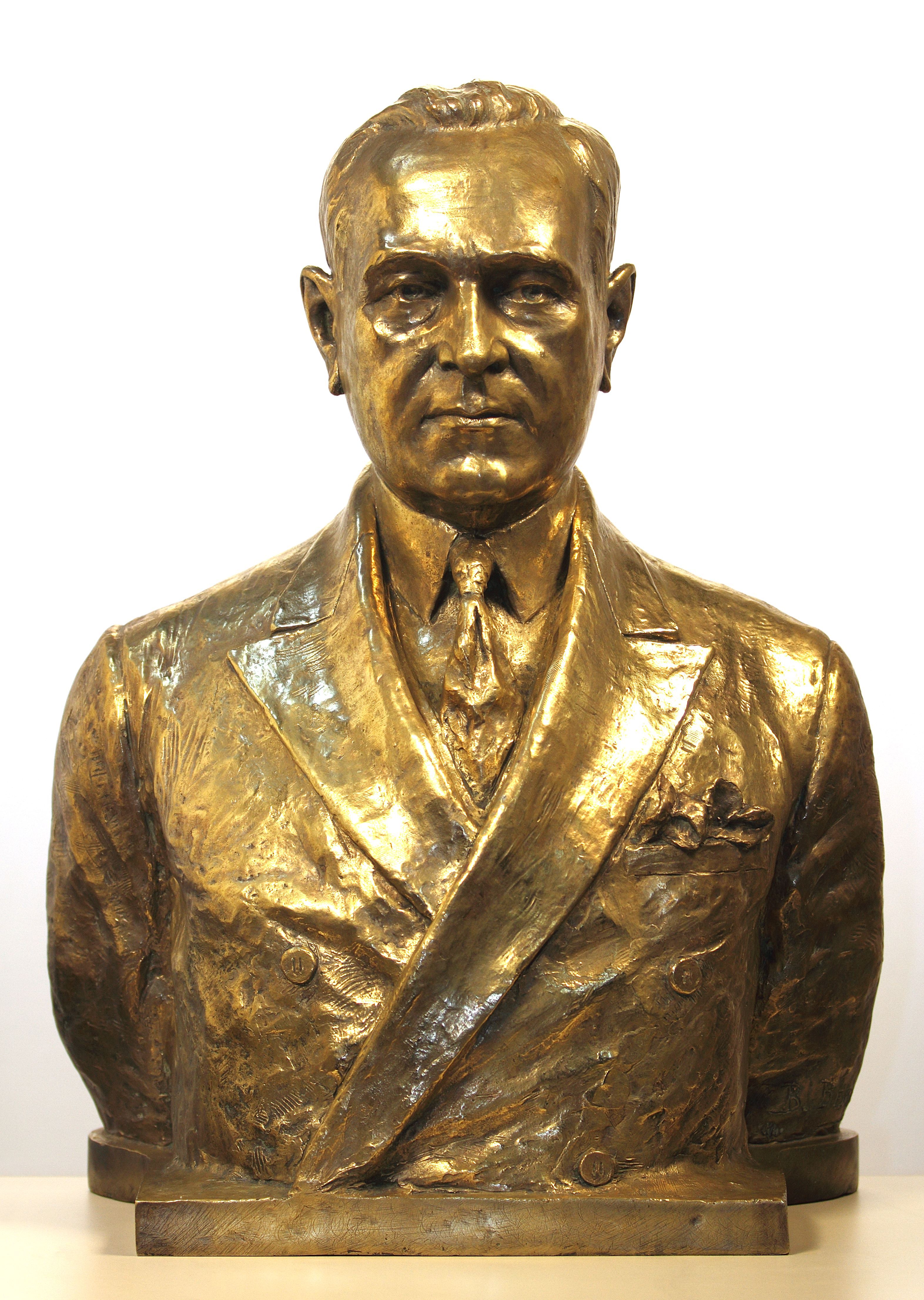 Busto em bronze de Getúlio Vargas (1882-1954). Foi o presidente do Brasil de 1930 até 1945, durante a Era Vargas, e, posteriormente, de 1951 até o seu suicídio em 1954. Localizada no hall principal ao lado à sala da presidência da Casa legislativa.