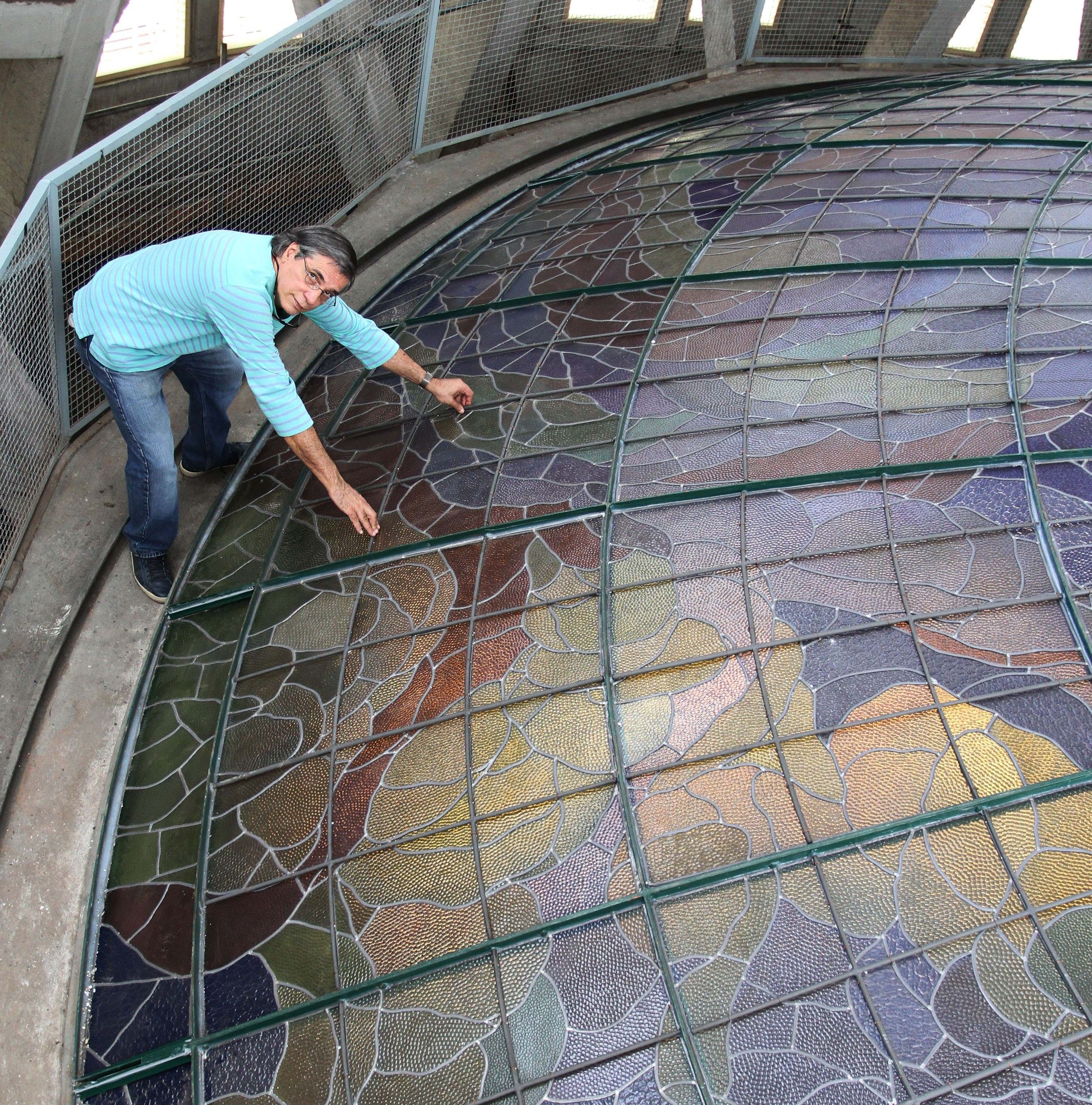 O vitral foi projetado por Cesar e Gastão Formenti. Na última restauração dos vitrais da cúpula , em 2017, a peça foi dividida em quadrantes, como um grande quebra-cabeça. Os componentes foram retirados de uma só uma vez, e depois recuperadas no atelier do vitralista Luidi Nunes.
