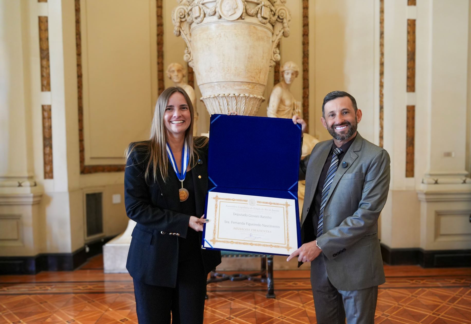 A Assembleia Legislativa do Estado do Rio de Janeiro entregou, nesta quarta-feira (12/11), a Medalha Tiradentes, maior honraria concedida pela Casa, para jornalista e Diretora de Cultura da Casa legislativa, Fernanda Figueiredo. A cerimônia aconteceu no Salão Nobre do Palácio Tiradentes, numa iniciativa do deputado Ratinho (Solidariedade).