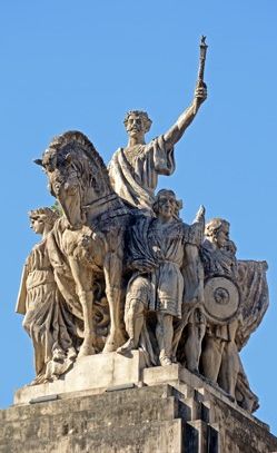 À esquerda do palácio na obra “Independência” aparece montado a cavalo e coroado de louros, o imperador Brasil Pedro I que ergue o cetro imperial e saúda a Nação. A seu lado estão o patrono da Independência, José Bonifácio. Completam a cena as Forças Cívica e Militar, a Resistência e o Patriotismo.