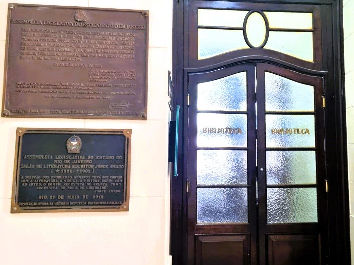 Nas placas à esquerda da entrada da biblioteca do Palácio Tiradentes, sede histórica da Alerj, tem a indicação que em decorrência do trabalho da servidora Maria Portugal Duque Costa, o espaço recebera seu nome em 1989, em reconhecimento ao desempenho e zelo na formação do acervo bibliográfico. A segunda placa, de 1989, faz menção ao nome do Salão de Leitura Jorge Amado (1921 - 2001), em homenagem ao escritor baiano.