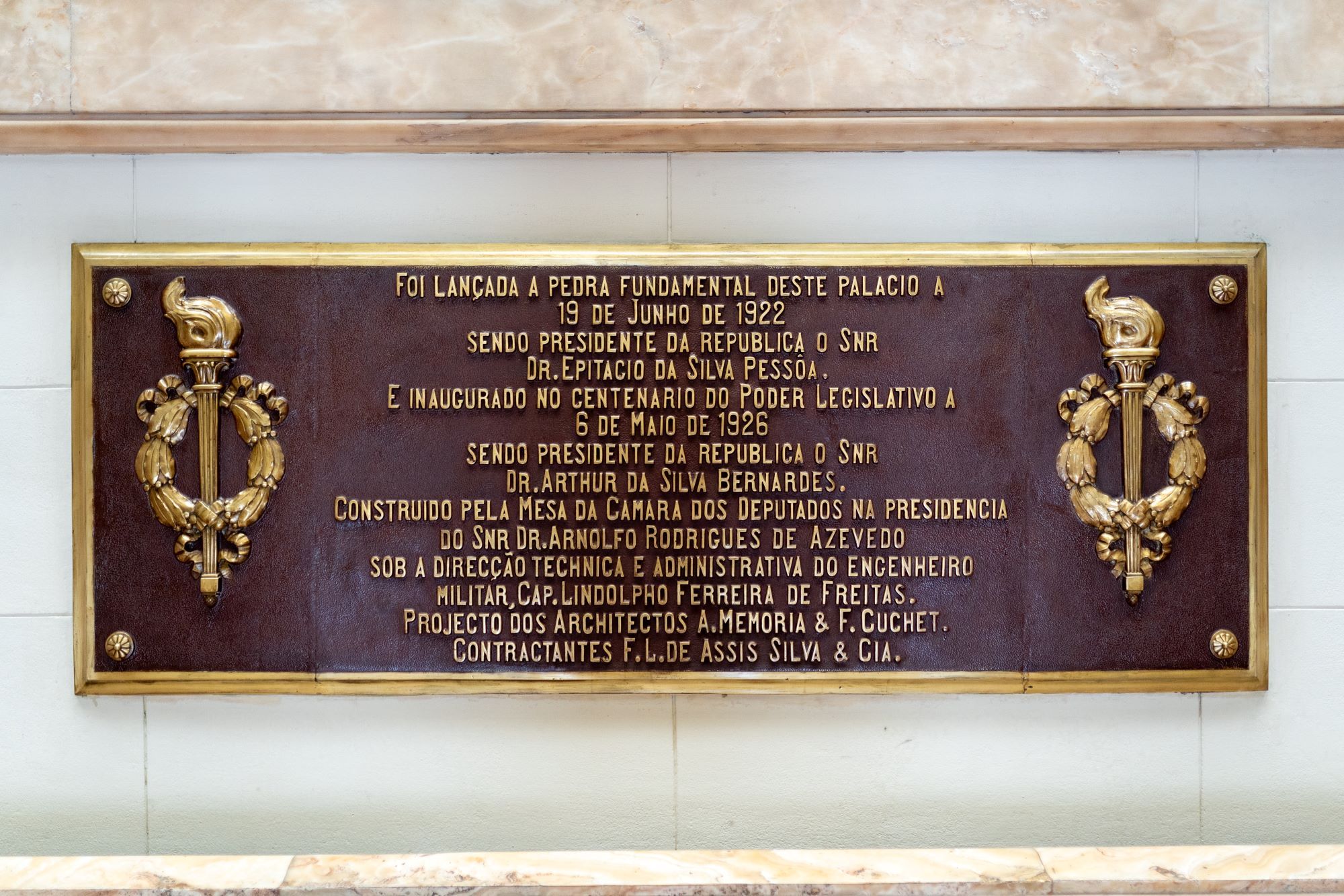 No patamar da escadaria interna do Saguão Getúlio Vargas do Palácio Tiradentes está uma placa em bronze e pintada com uma tonalidade de vermelho que se assemelha à cor do vinho tinto, que destaca o lançamento da pedra fundamental da obra da nova Câmara dos Deputados em 19 de junho de 1922.