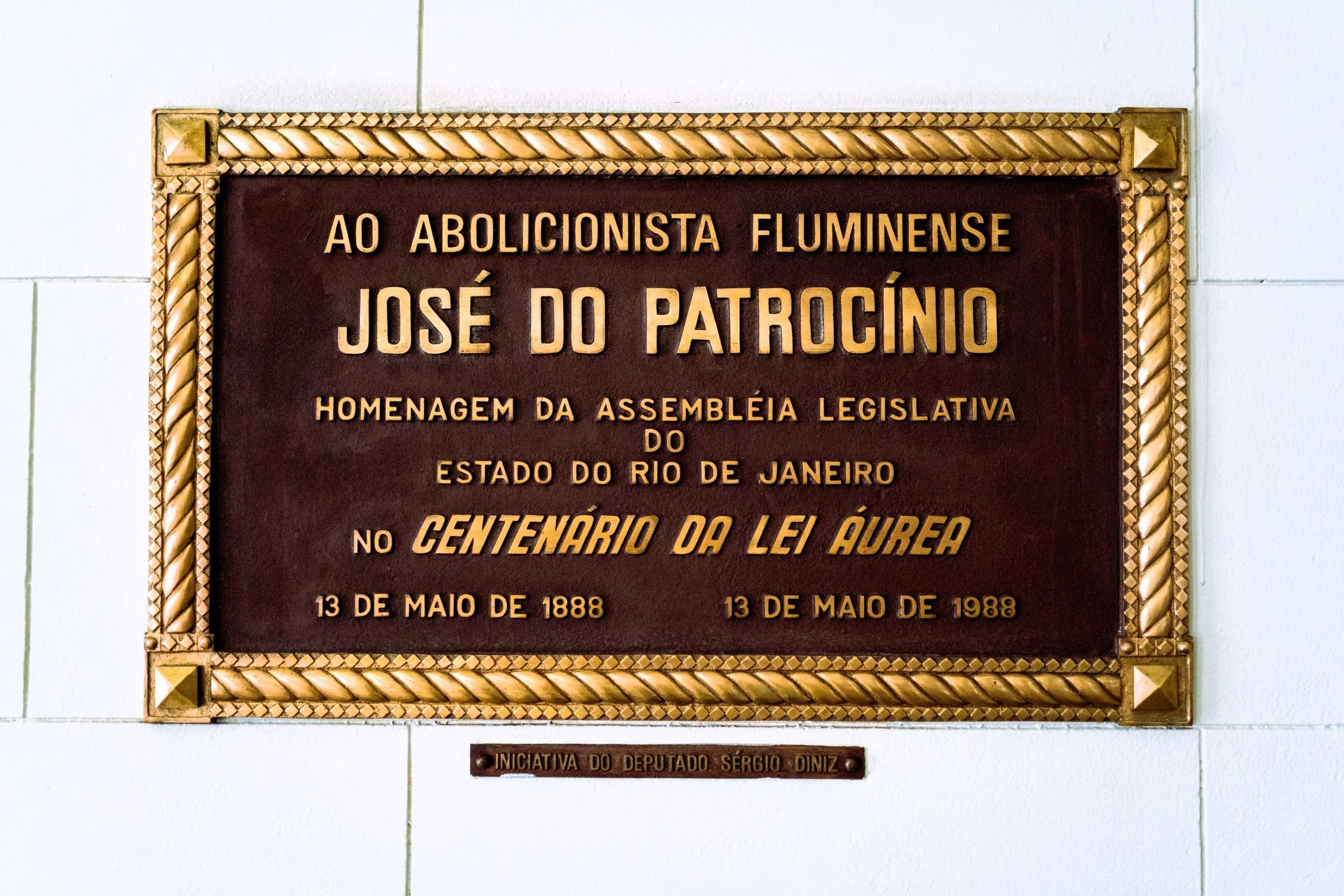 Está localizada ao lado esquerdo do saguão principal do Palácio Tiradentes a placa em homenagem ao abolicionista José Carlos do Patrocínio (1853 — 1905), em alusão ao centenário da lei Áuerea, em 1988. Jornalista, escritor e ativista político brasileiro ele era chamado de “Tigre da Abolição” e ajudou a criar uma série de instituições que trabalharam contra a escravidão e destacou-se como uma das figuras mais importantes do movimento abolicionista no Brasil. Foi também idealizador da “Guarda Negra”, que era formada por negros e ex-escravizados, sendo vanguarda do movimento negro no Brasil. A finalidade da guarda era proteger a família imperial brasileira contra a aristocracia e os militares.